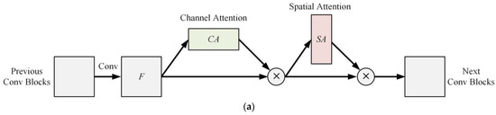 where and represent the channel- and spatial-attention modules, respectively; represents a feature map; represents a sigmoid function; represents a multilayer perceptron; and represents a convolution operation with a filter size of 7 × 7.