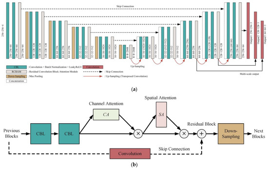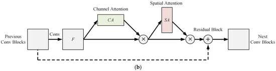 Diagrams of convolution block attention modules (CBAMs): (a) CBAMs; (b) residual convolution block attention module (RCBAM).