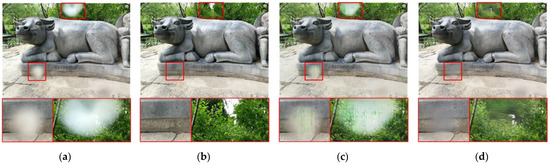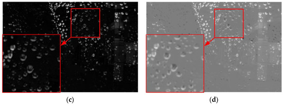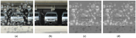 Figure 6 shows an example of the generated raindrop mask. Figure 6a,b depict the raindrop image and the clean image, respectively. Figure 6c shows the raindrop mask obtained using Equation (4). Figure 6d shows the generated raindrop mask using the raindrop-mask network. The result demonstrates that the real mask and generated mask are almost identical.
