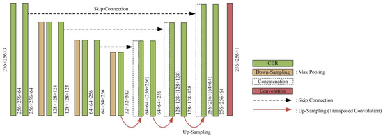 Figure 5 shows the architecture of the raindrop-mask network. This model comprises several components: the CBR block, the skip connection, and concatenation as well as the downsampling, upsampling, and convolution layers. The CBR block comprises the convolution layer, batch normalization, and the ReLU activation function. The downsampling and upsampling layers use max-pooling and two-dimensional (2D) transposed convolution layers, respectively. The skip connection connects the previous layers to the upsampled layers. This connection allows the network to learn the low-level and high-level features and facilitates the integration of detailed information with abstract representation. The skip-connected layers concatenate the previous layers and upsampled layer channel-wise. The convolution layer is applied without the ReLU activation function. All convolution layers in the rain-mask network use 3 × 3 spatial filters with a stride of 1 and padding of 1. The max-pooling and transposed convolution layers use a 2 × 2 spatial filter with a stride of 2. The input raindrop images are a color image with three channels and output raindrop masks are a grayscale image with a single channel. Each image is normalized from −1 to 1. The loss is calculated using mean square error: