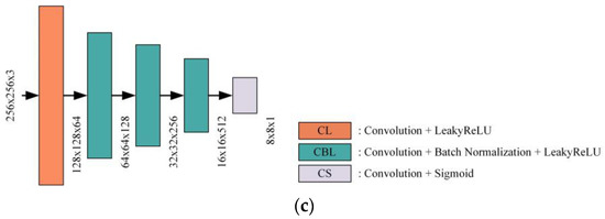 The discriminator is used to improve the performance of the generator by distinguishing the generated clean image from the real clean image. The proposed model uses a discriminator in the form of PatchGAN with a 70 × 70 receptive field. Unlike PixelGAN, where the existing discriminator distinguishes real/fake for a single value, PatchGAN distinguishes real and fake for local image patches. This is a form of texture/style loss and can generate more high-frequency components than PixelGAN. The size of the 70 × 70 receptive field results in higher sharpness in both the spatial and color dimensions [2]. Figure 7c shows the discriminator used in the proposed model. The first CL block comprises a convolution layer and the LeakyReLU raindrop-removal network. The middle block CBL includes a convolution layer, batch normalization, and a LeakyReLU activation function. The last CS block includes a convolution layer and sigmoid activation function. All convolution layers in the discriminator use 4 × 4 spatial filters with a stride of 2 and a padding of 1. The negative slope of LeakyReLU is 0.2.