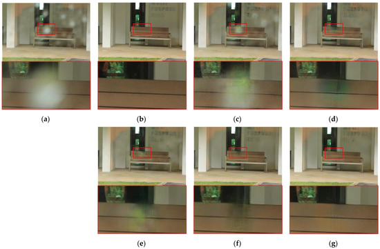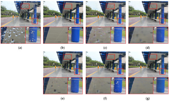Figure 13 shows that the raindrops within the image are opaque. There are large raindrops on the bench. In the models shown in Figure 13c–f, the restoration of the bench area is not successful. As a result, the raindrop area remains and the color appears distorted. In Figure 13g (proposed model), the raindrop area is effectively removed and the color is restored to be similar to the surrounding color.