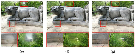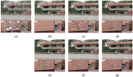 Figure 12 shows that small raindrops with bright or dark brightness are distributed over the entire image. The restored roof area in Figure 12c (Pix2Pix) exhibits a significant amount of noise, and traces of raindrops in the fire hydrants are still visible. In Figure 12d–f, the shape of the raindrops remains in the roof area, and the inside of the raindrop regions appears blurred, resulting in a lack of detail in the roof. In Figure 12g (proposed model), although there is some noise in the roof area, the overall restoration is good. Additionally, the fire hydrant has been well restored, resulting in high color saturation and a clear image.