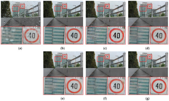 In Figure 10, small raindrops are evenly distributed throughout the image. Each model is compared with respect to the areas of buildings and road signs in the background. In Figure 10c (Pix2Pix), the details of the windows of the building appear blurred, and the numbers and red circular parts on the road sign appear blurry. In Figure 10d (ATTGAN), the details of the window area of the building are clear, but the restored area has a gray color. Additionally, the saturation of the road signs is low. In Figure 7e (R2Net), the details of the window area of the building are not clear. In Figure 10f (TUM), the restoration of the window area of the building is excellent, but traces of raindrops can still be observed on the road sign. In Figure 10g (proposed model), a clearer image is produced compared with the other models, with excellent restoration of the window areas of the building and road signs; moreover, the saturation of the road sign is high.