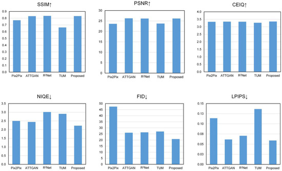 Table 1 and Figure 14 show the results of each model for the IQAMs. The best-performing model is indicated in bold, while the second-best model is underlined. The proposed model demonstrates superior performance, achieving the highest scores in CEIQ, NIQE, FID, and LPIPS, as well as the second-highest scores in SSIM and PSNR. These results confirm the superiority of the proposed model over other models. FID and LPIPS scores show a significant improvement of 19.84% and 4.84%, respectively, compared to ATTGAN. This indicates that the perceptual similarity between the generated images and real images is higher in the proposed model compared to other models.