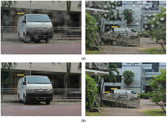 The results of the object detection (YOLOv7) for the raindrop and raindrop-removal images. (a) raindrop images; (b) proposed raindrop-removal images.