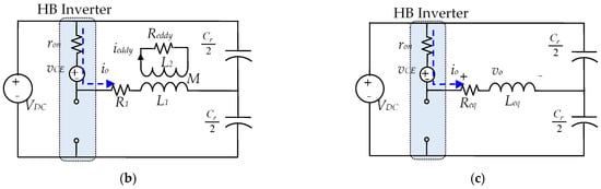 Electrical circuit diagram of three-phase induction heating system; (a) AC/DC/AC circuit; (b) magnetic coupling of the coil–cookware; and (c) equivalent impedance of coil–cookware.