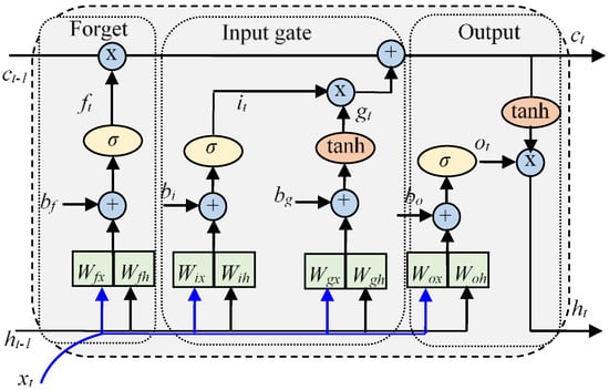 LSTM is proposed in [45] to add the long-term memory state (cell state) capability to the short-term memory capability of RNN. Figure 2 depicts the structure of an LSTM cell, which includes input, output, and logic gates. Firstly, the LSTM cell starts with a forget gate which is responsible for forgetting or preserving the previous cell state data, ct−1. The forget decision is made by passing the input data, xt, and the previous hidden state, ht−1, through a sigmoid activation function, whose output value, ft, is between [0,1], as shown in (11) and (12).