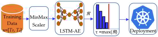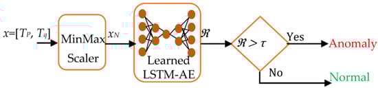 Figure 4 shows the training methodology of the proposed LSTM-AE model. Firstly, we need to collect large training data that consist of two features xt = [Tp, Tq]. The training data are collected during the normal operation of the IH system under different users’ behavior and different sizes and materials of cookware. After that, the training data are normalized using the maximum–minimum scaler, as in Equation (20). Then, the LSTM-AE model will learn by reducing the residual error between the input data (xt) and the reconstructed output data (). Then, the threshold value is chosen to be the maximum residual error. Finally, the learned LSTM-AE model will be deployed to detect anomalies by reconstructing the input data and comparing the residual error with the threshold value to detect the anomaly, as shown in Figure 5.