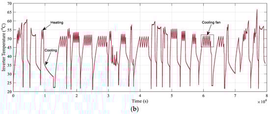 The total power losses, PL, of the half-bridge inverter module include the power losses of IGBTs, PQ, and the power losses of diodes, PD, as in (8). PQ is very high compared to PD due to switching losses. PQ depends on the collector–emitter voltage, vCE, and the output current, io, as shown in (9). These losses increase the junction temperature of the IGBT, which changes the case temperature of the IGBT module, Tq, as shown in (10) [44].