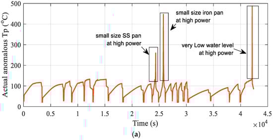 On the pot side, overheating can occur due to the usage of small cookware with inappropriate power levels or due to the small amount of water with a high power level. The overheated cookware can cause hazards to the users and, at the same time, can cause the maloperation of the IH system itself. Figure 8a shows the collected data on pot temperature which include the normal temperatures and abnormal overheating that exceeded 400 °C.