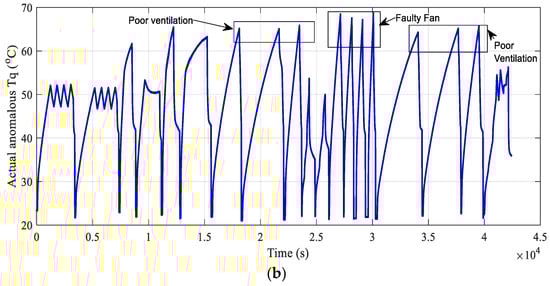 On the inverter module, the overheating of system components, such as the inverter module, will cause fast degradation and maybe permanent failure. Therefore, cooling fans are used to maintain the temperature as low as possible. However, poor air ventilation due to the inappropriate placement or faulted fan will lead to the system overheating. Therefore, early detection of these anomalies will prevent system failure. In this work, we collect data on inverter temperature under normal cooling and abnormal cooling conditions, as shown in Figure 8b. It is noticeable that with a bad cooling system, the inverter temperature will keep rising compared to the normal cooling system. Finally, all collected data at different operating conditions are merged into a single time series data with a total time of approximately 43,000 s.