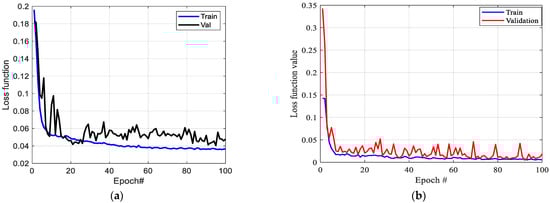 In this work, the temperatures in the IH system vary with time, the behavior of users, the type of cookware, and input power. The collected temperatures have spatial and temporal correlations. Therefore, we selected the LSTM neural network because it has a long memory cell besides its short memory cell, which enables it to trace the abrupt variations of the time-series trajectory of the measured temperatures. To verify the efficacy of the LSTM-AE model, we compared it with other learned AE models based on the recurrent neural network (RNN) and the dense neural network (DNN). Figure 14a,b depicts the convergence of training and validation loss functions of the RNN-AE and dense-AE models. Figure 15a,b shows the anomaly detection on the inverter side using the RNN-AE and the dense-AE models. Unlike the LSTM-AE model, these models are not able to detect anomalies in the pot side based on the inverter temperature.