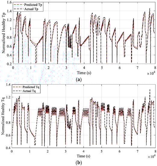 To verify the effectiveness of the learned LSTM-AE model to reconstruct the input data, we apply the learned LSTM-AE to predict the training data using the predict function in Keras. Figure 10a shows the comparison between the predicted (red line) and measured (black line) pot temperatures (Tp) which are normalized by 100 °C. Figure 10b compares the predicted (red line) and measured (black line) inverter temperatures (Tq) which are normalized by 50 °C. It is obvious that the LSTM-AE model is able to trace the time series variations of heating and cooling operating conditions of pot and inverter temperatures curves.