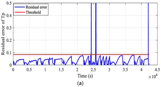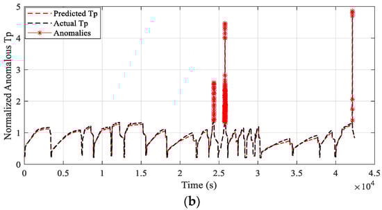 In this section, the learned LSTM-AE model is applied to predict the testing data that is explained above in Section 5.1.2 and calculate the residual error between the predicted and measured data. Then, the residual errors are compared with the threshold values in Section 5.3. Figure 12a compares the threshold value with the time series residual error between the predicted and measured pot temperatures, Tp. If the residual error is bigger than the threshold value, e.g., overheating, the proposed AD algorithm will detect and alarm the existence of anomalous cases, as shown in Figure 12b. Furthermore, to verify the effectiveness of the learned LSTM-AE model, the predicted and measured temperatures are compared as in Figure 12b.