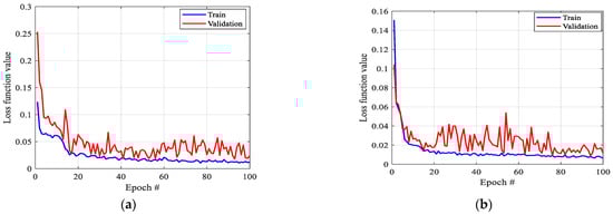 Then, these time series data are converted to a three-dimensional array (80,000, 2, 1) to fit the input of the LSTM network. Then, the weight and base parameters of the LSTM layers are updated using the Adam optimizer by minimizing the loss function, mean absolute error (MAE). The convergence curves of the loss function during training and validation show the existence of overfitting, as shown in Figure 9a. Therefore, to reduce the overfitting and underfitting, we applied the random search tuner in Keras to tune the hyperparameters of the LSTM-AE model, as shown in Table 2. Figure 9b shows the improvement of the convergence curves of training and validating the loss function. Both training and validation losses converge to the minimum value very fast, approximately around 20 epochs. This indicates that the proposed LSTM-AE model is well-learned. Figure 8 shows the comparison between the input and output training data.