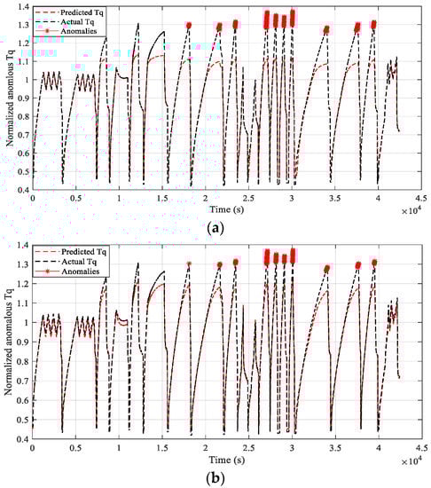 Furthermore, on the inverter side, the learned LSTM-AE model is applied to detect the anomalies. The testing data in Section 5.1.2 are used to verify the robustness of the learned LSTM-AE model. Figure 13a compares the threshold value with the time series residual error between the predicted and measured inverter temperature. If the residual error is bigger than the threshold value, the proposed AD model will consider it as an anomaly and send alarms. Figure 13b labels the anomalies (red stars) on the times-series trajectories of predicted and measured inverter temperatures, Tq.