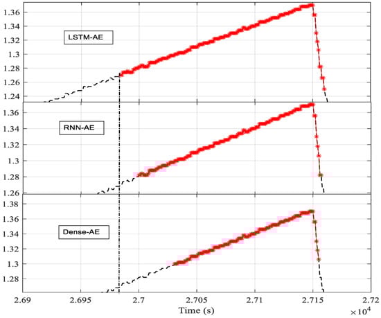 Figure 16 presents a clear comparison between the LSTM-AE model and other models, namely the RNN-AE and dense-AE models. We selected a sample of anomalies in the inverter side between the time intervals 26,900 s and 27,200 s. It is obvious that the LSTM-AE model detected the anomalies earlier than the other models: approximately 20 s earlier than the RNN-AE model and 50 s earlier than the dense-AE model.