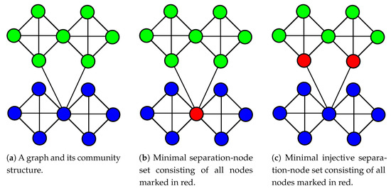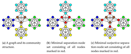 Using Lemma 1 to show “⊇”, we now show “⊆”. Let be an arbitrary separation-node set and x the corresponding binary vector 0 flagging the nodes belonging to S. Assuming , at least two adjacent nodes belonging to different communities exist following the definition of P. These nodes subsequently belong to the same connected component of the graph induced by implicating that no community can exist that resembles a superset of the nodes inducing the connected component . Therefore, S cannot be a set of separation nodes as the corresponding refinement map cannot exist, yielding a contradiction and showing . □
