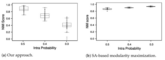 This figure shows the Normalized Mutual Information (NMI) score of the presented approach for 50 different graphs each based on ground truth and a perfect separation edge estimator coupled with the greedy separation-node assignment. The NMI score as defined in [43,44] was used, as it resembles a well-proven measure for the accuracy of a community given the ground truth [45]. The different probabilities for intra-community edges in the chosen SBM model resemble different difficulties according to the phase transition known for this model. The lower the stated probability, the harder the problem. The probabilities were chosen such that the hardest graphs barely differed from a null model inheriting no measurable structure up to the hardest that still allowed perfect NMI scores. For this dataset, the phase transition can be calculated to be at a probability of 0.2865 for the intra-community edges. As modularity maximization has been shown to perform very well up until the sharp phase transition (which is not reached here), the constantly good results for the SA based approach appear to be reasonable. Additional tests show a sharp performance drop off to NMI values at around 0.5 for smaller intra-probabilities such as 0.23.