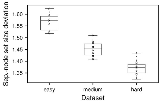The y-axis depicts the deviation factor from the best-known separation-node set in size. Notably, the absolute sizes of the identified separation-node sets are typically similar over the different difficulties, while they rise slightly for larger graphs.