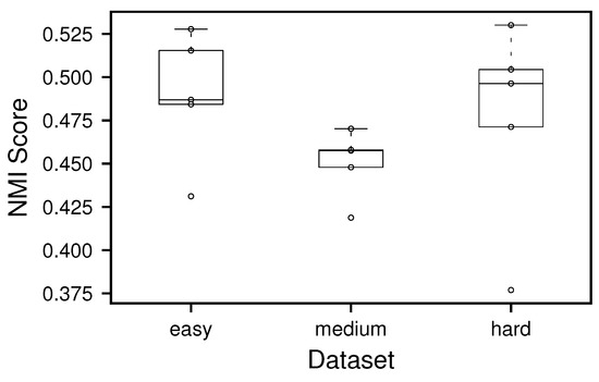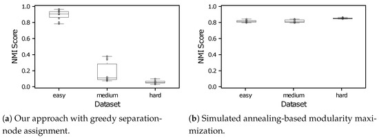 This figure depicts the normalized mutual information score of the selected SBM benchmark graph using a simulated annealing-based approach of assigning the separation nodes to communities. The worse performance for the easy dataset clearly indicates that the chosen simulated annealing approach based on the QUBO as described in Section 3.6 is suboptimal in general.