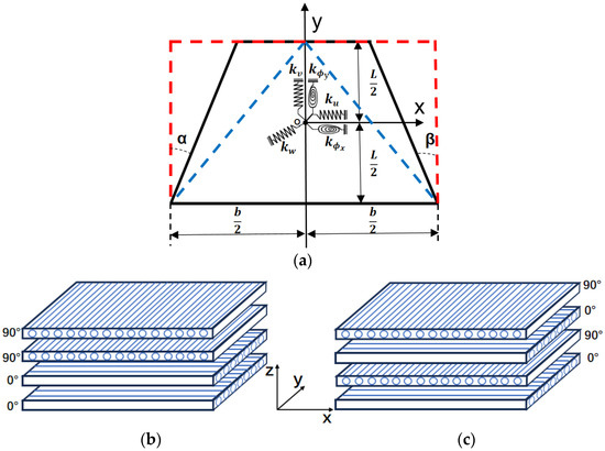 As shown in Figure 1, there is a four-layer, fiber-reinforced, composite trapezoidal bi-stable laminate. A Cartesian coordinate is constructed at the midplane of the TBL, as depicted in Figure 1a. The asymmetric and antisymmetric stacking sequences are considered, respectively, as shown in Figure 1b,c. The boundary conditions are defined as four-sided free edges with elastic supports at the midpoints of the median lines, which is simulated using five artificial springs, where , , and represent three translational springs, while and mean two rotational springs. Assuming the laminate has a base length of b, height L, and thickness h, the angles α and β represent the angles between the two legs of the laminate and the perpendicular baseline, respectively. By changing the size of α and β, bi-stable plates of different shapes can be obtained, such as trapezoidal plates, square plates, and triangular plates.