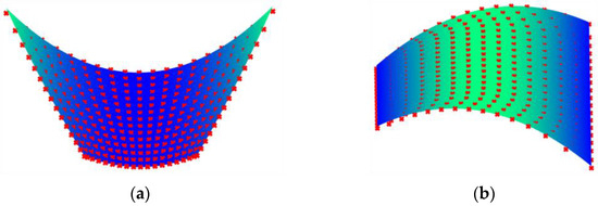 To verify the accuracy of this current method for calculating the stable configurations of the TBL, the stable configurations are compared with finite element results. The TBL has the base length b = 1 m, height L = 0.5 m, and the thickness . Figure 4 and Figure 5 show the comparison for the asymmetric TBL () and the triangular bi-stable plate (), respectively. As shown in the figure, configuration 1 of the TBL is bent in the x direction, and configuration 2 is bent in the y direction. In the finite element software ABAQUS, the element type of trapezoidal bi-stable plate is SR4, and the number of elements is 168. The element type used for the triangular bi-stable plate is S3, and the number of elements is 226. The results show a good agreement between them.