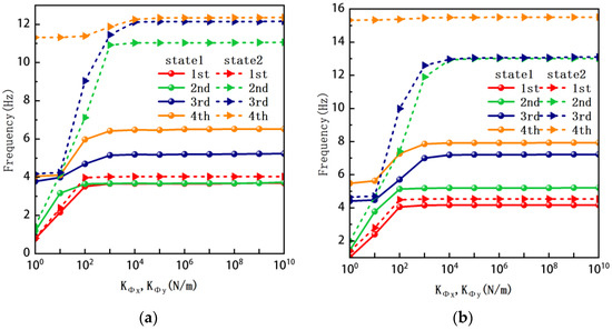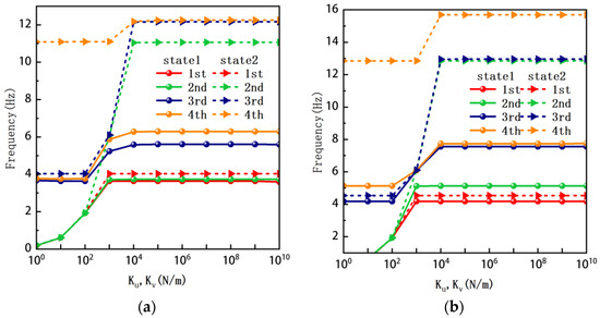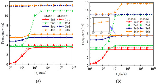 Figure 6a shows the natural frequencies of the two stable configurations for an asymmetric TBL. It can be observed that as the stiffness of the lateral displacement-constraint springs increases, the second frequency of stable configuration 1 remains relatively constant, while that for stable configuration 2 undergoes the largest variation. The first natural frequencies of both stable configurations exhibit a similar trend. It is worth noting that the third and fourth natural frequencies of stable configuration 2 are close in magnitude, while they show a similar variation trend for stable configuration 1. Overall, when the stiffness of the lateral displacement-constraint springs increases to 105 N/m, the first four natural frequencies of the TBL remain essentially unchanged.