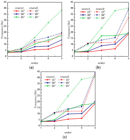 Figure 9 illustrates the influence of the bottom angle on the natural frequency of the asymmetric TBL under the three types of elastic boundary conditions listed in Table 12. From Figure 9, it is illustrated that the natural frequencies of state 2 for the three different bottom angles of the TBL are all greater than that of state 1. Under the E1 boundary condition, the natural frequency of each order of the asymmetric trapezoidal bi-stable plate increases with the decrease of the bottom angle. And the influence of the bottom angle on the natural frequencies increases with the order of the modes. Under the E2 and E3 boundary conditions, as the bottom angle decreases, the first-, second-, and fifth-order natural frequencies of the TBL are basically unchanged, while the third- and fourth-order frequencies increase significantly.