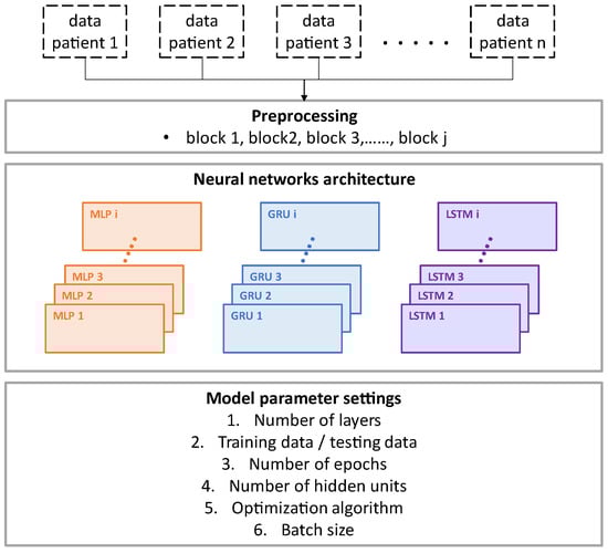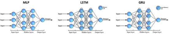 In this process, the selection of the algorithm type and the number of networks in the ensemble is crucial, as illustrated in Figure 1. The proposed model utilizes three types of algorithms: MLP, GRU, and LSTM. However, it is essential to explain why an ensemble of I networks for each algorithm type is used (i being an integer representing the number of networks in the architecture). Ensembles of neural networks have been shown to minimize generalization errors, provide higher accuracy, and enhance learning [38,39,40,41].