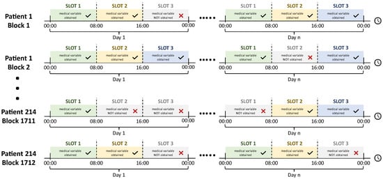Given that the database provided by the Complejo Hospitalario Universitario Insular—Materno Infantil de Las Palmas de Gran Canaria does not have this ideal situation, the first step to perform is adapting it to follow the pattern of the ideal scenario. To achieve this, the data are divided into blocks. For each patient, 8 blocks will be obtained (1 for each medical variable), and there will be a total of 1712 blocks, as there are 214 patients. Each block will be divided into days (as many days as the patient is admitted to the ICU), and each day will be divided into 3 slots (following the scheme in Figure 2). Once this slot structure is available, the value of the medical variable will be assigned to the corresponding slot. If no medical variable value is available in a slot, this slot will remain empty.