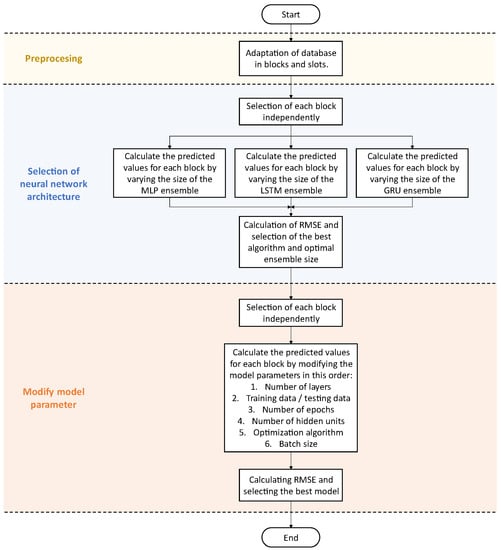 The methodology employed can be described as follows. Once the data has undergone pre-processing and sorting, the neural network architecture is chosen. This involves selecting the algorithm type and the number of networks in the ensemble. The three types of algorithms (MLP, GRU, and LSTM) are applied independently to each block, with the number of networks in the ensemble varied to obtain the predicted values. The optimal architecture is determined based on the lowest RMSE (Root Mean Square Error) and computational cost. This selected architecture is then used in the model to retrieve the missing data.
