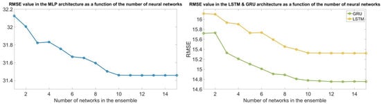 We tested the three algorithms described above. MLP is a direct feed-forward neural network with no memory capability, while GRU and LSTM are recurrent neural networks with recurrent connections and gates that allow them to remember previous sequence information. In addition, we can compare the results of the three algorithms as a function of the number of neural networks forming the ensemble in order to find the optimal architecture. Table 3 shows the RMSE results of the three algorithms as a function of the number of networks in the ensemble. Furthermore, Figure 6 displays the outcomes obtained from assessing the assembly’s performance with varying numbers of nets. The aim is to identify, based on the obtained results, the optimal number of nets required to form the assembly for each of the three architectures.