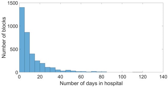 It is important to assess the performance of the model. To do so, we can check how the model behaves as a function of the number of days the patient is in hospital. Figure 7 shows the histogram that enables us to determine the distribution of the data of the different blocks according to the number of days the patient is in hospital, in order to detect patterns or trends.