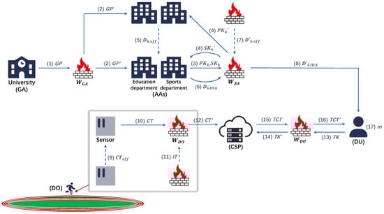 Encryption phase: (9) In physical ability testing, the sensors worn by students collect their current physical ability data in real time. After obtaining the ciphertext by encrypting the data using the attributes, it is then uploaded to the CSP. (10) The offline/online technology is used in the encryption for saving computational costs. (11) and (12) The ciphertext generated by the sensors is not immediately sent to the CSP but is first transmitted to the CRF, which updates and transforms the ciphertext.