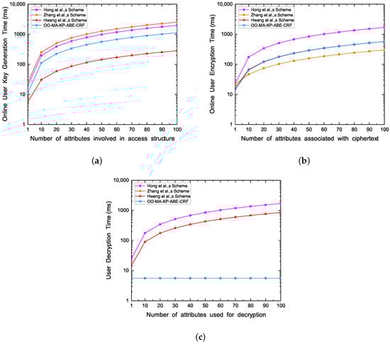 Computational cost comparison of online key generation, encryption and decryption [16,21,26]. (a) The online user key generation cost. (b) The user encryption cost; (c) The user decryption cost.