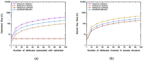 Storage cost comparison of ciphertext and secret key [16,21,26]. (a) The ciphertext storage cost. (b) The secret key storage cost.