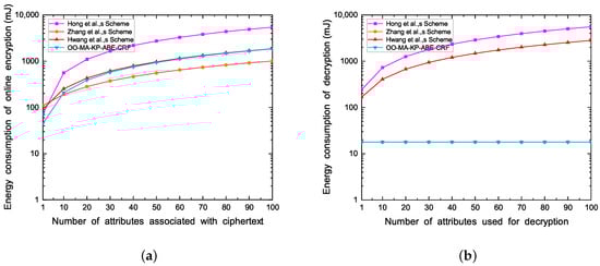 Energy consumption. (a) The energy consumption of online encryption [16,21,26]. (b) The energy consumption of decryption.