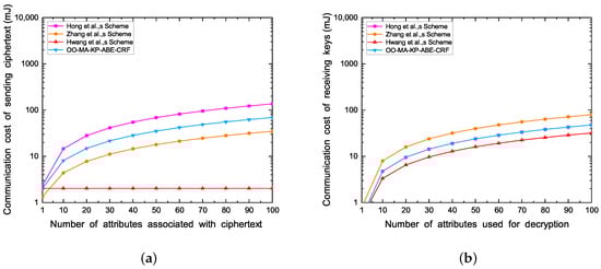 Communication cost. (a) The communication cost of sending ciphertext [16,21,26]. (b) The communication cost of receiving keys.