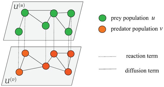 We divide the population on the multiplex ER random networks into two categories: prey population and predator population . The schematic diagram is shown in Figure 1. The prey population and predator population occupy every node in layers and , respectively. There is an interactive relationship between two populations across the layers through the imaginary lines, which means the reaction term and . Meanwhile, species on the network will also flow in or out of this node on their own layer through the solid lines, which means the diffusion term and .