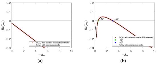 Dispersion relation between Laplace eigenvalue () and model (1) eigenvalue () with different diffusion rate. The predator diffusion rate is d- for (a). The predator diffusion rate is d- for (b). Where the average degree is . The rest of the parameters are d-, and .