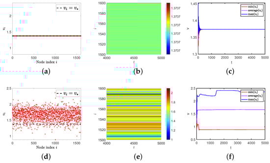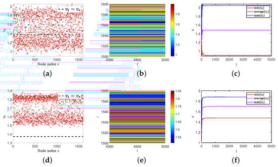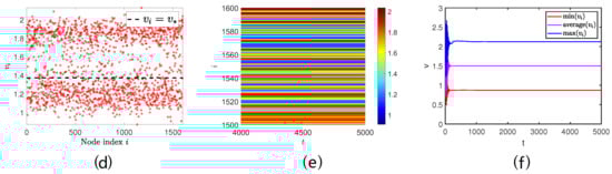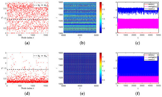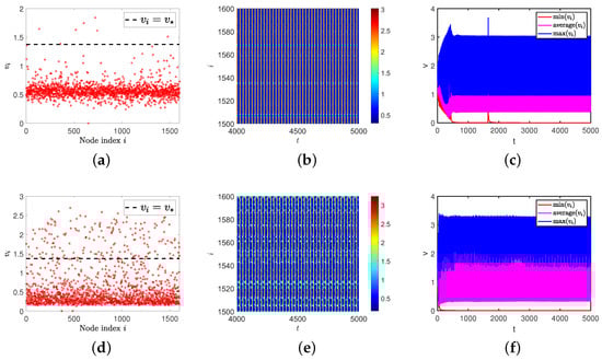 When we theoretically analyze the Turing instability on the network, we find that the premise of the Turing pattern always requires that the positive equilibrium in the non-diffusion model is always stable. If the positive equilibrium in the non-diffusion model is not stable at this time, what kind of spatial distribution state will the model present? On continuous media, Nagano and Maeda discovered the existence of spiral and lattice patterns [3]. What will happen on the ER random network? It should be pointed out that this spatial pattern type is not a Turing pattern but another spatiotemporal pattern. Therefore, the following experiments were carried out. The value of the parameter is the same as Section 3, except for .