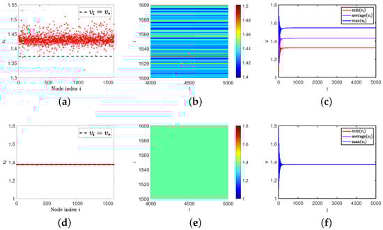 It is well known that diffusivity plays a decisive role in the formation of Turing patterns on continuous media, but is it the same on discrete media or complex networks? Kouvaris et al. provide an answer to this in their work, stating that, even if two populations have the same diffusion rate on multiplex networks, a Turing pattern will be generated [18]. Therefore, we hope to verify whether this conclusion is equally applicable to our model. Before starting the experiment, we set the diffusion rate of the two populations to and determine the average degree on the layer. We observe the changes in the spatial distribution pattern of species by changing the average degree on layer. The threshold conditions for generating Turing bifurcation can be obtained from Equations (7) and (8), as shown in Figure 7. It is not difficult to find that the Turing instability condition does not hold when the average degree of the two layers network is the same (). So, we increase the average degree on layer, which leads to Turing instability. By comparing Figure 4d,e,f and Figure 8, it can be intuitively seen that the Turing pattern has evolved from scratch. In addition, we also find that the spatial distribution of species changes with the increase of average degree differentiation in different layers.