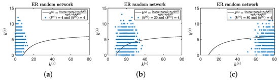 (a–c) represent degree combination for pairs of nodes in plane together with the curve of Turing bifurcation (black) on multiplex ER random networks. The average degree on layer is , , and for (a–c), where they have the same average degree on the layer .