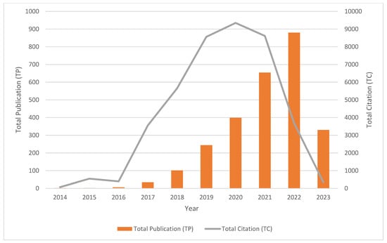 The trends and growth of digital twin can be observed from the total number of publications (TP) and total citations (TC). From 2014 to 10 May 2023, there was a collection of 2652 documents on digital twin in the supply chain, with 40,768 total citations. Table 2 tabulates the publication trends of digital twin in the supply chain. Figure 2 demonstrates the trends of publication and citation for digital twin in the supply chain.