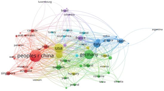 Figure 3 displays the country co-authorship diagram. China has the largest node size because China had the highest number of publications. The line between China and the United States is the thickest, indicating the strongest collaboration between China and the United States, with a link strength of 49. China and Sweden also have a strong collaborative relationship, with a link strength of 33. China and England also work well, with a link strength of 31.