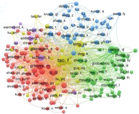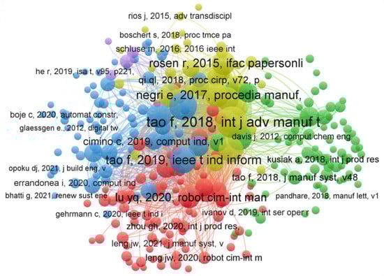 The top 10 co-cited authors are shown in Table 9, while Figure 5 describes the author co-citation network. It is worth to note that Tao, F., is an expert in intelligent manufacturing and authored the papers “Digital twin-driven product design, manufacturing and service with big data” [13], “Digital twin in industry: state-of-the-art” [84], “Digital twin and big data towards smart manufacturing and Industry 4.0: 360 degree comparison” [83], and “Digital twin shop-floor: a new shop-floor paradigm towards smart manufacturing” [88], which received 1002, 814, 569, and 479 citations, respectively. Grieves, M., whose expertise is in product life cycle management, authored the book chapter “Digital twin: mitigating unpredictable, undesirable emergent behavior in complex systems” [92], with 1033 citations on Scopus and 2010 citations on Google Scholar. J. W. Leng’s work focuses on blockchain, mass individualization, smart manufacturing, and Industry 5.0. He wrote the paper “A digital twin-based approach for designing and multi-objective optimization of hollow glass production line” [94], with 208 citations on the Web of Science database.