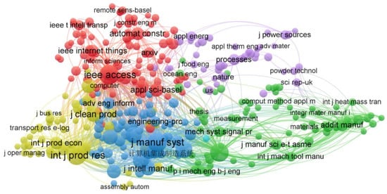 The co-citation of publication title is presented in Figure 6. The International Journal of Advanced Manufacturing Technology (IF = 3.563, Q2); International Journal of Production Research (IF = 9.018, Q1); Journal of Manufacturing Systems (IF = 9.498, Q1); IEEE Access (IF = 3.476, Q2); Procedia CIRP, CIRP Annals—Manufacturing Technology (IF = 4.482, Q2); Procedia Manufacturing, Robotics and Computer-Integrated Manufacturing (IF = 10.103, Q1); Journal of Cleaner Production (IF = 11.072, Q1); and IFAC Papers-Online are the top 10 co-cited sources.
