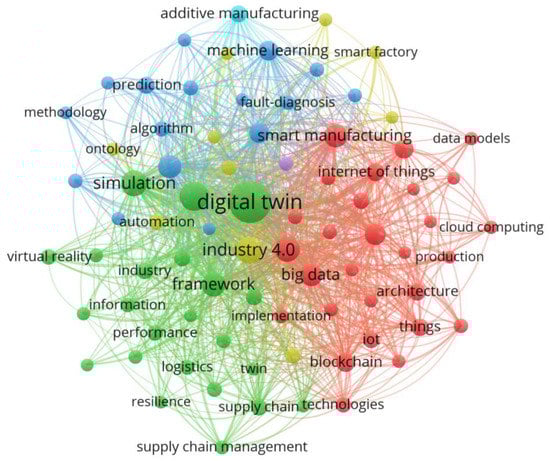 Table 10 shows the top 10 keywords regarding digital twin in the supply chain. Figure 7 describes the keyword co-occurrence map. As shown in Figure 7, the first cluster in red focuses on the process of designing and building a digital twin model, where the keywords are made up of architecture, artificial intelligence, big data, blockchain, cloud computing, cyber–physical system, data models, edge computing, Internet of Things, security, and sensors. The second cluster, which is green, involves the implementation and integration of digital twin to increase the efficiency in industrial uses, with keywords such as augmented reality, building information modeling (BIM), decision-making, discrete event simulation, industry, integration, logistics, manufacturing system, performance, resilience, supply chain, sustainability, and virtual reality. The third cluster is in blue and focuses on digital twin in quality controls and improvements. The keywords in this cluster are data analytics, deep learning, fault diagnosis, genetic algorithm, intelligent manufacturing, machine learning, optimization, prediction, predictive maintenance, and quality. The fourth cluster is in yellow and highlights the contribution of digital twin in digitalization and industrialization. The keywords are automation, digital manufacturing, digital transformation, Industry 4.0, modeling, and smart factory.